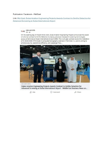 Publication: Facebook – Mid East Link: Mid-East: Dubai Aviation Engineering Projects Awards Contract to Smiths Detection for Advanced Screening at Dubai International Airport