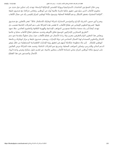 بﺎﻌﻟألا لﺎﺠﻣ ﻲﻓ ﺪﺋار ﻲﻤﻴﻠﻗإ ﺰﻛﺮﻤﻛ ﻲﺒﻇﻮﺑأ ﺔﻧﺎﻜﻣ ﺦﻴﺳﺮﺗو ،ﺔﻴﻠﺤﻤﻟا ﺔﻓﺎﻘﺜﻟا ﻢﻋدو ،رﺎﻜﺘﺑالا ﺰﻴﻔﺤﺘﺑ كﺮﺘﺸﻤﻟا ﺎﻨﻣاﺰﺘﻟا”.