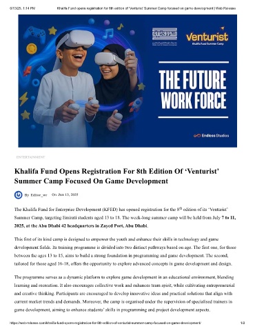 6/13/25, 1:14 PM Khalifa Fund opens registration for 8th edition of ‘Venturist’ Summer Camp focused on game development | Web Release