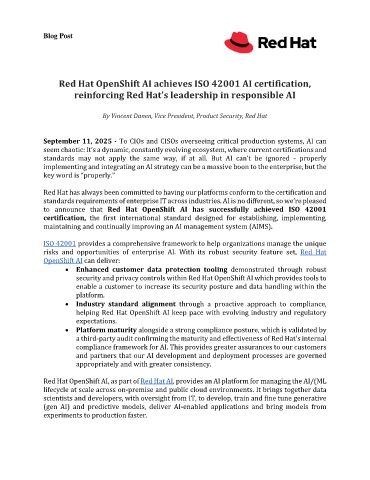 to announce that Red Hat OpenShift AI has successfully achieved ISO 42001
