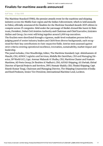 in Dubai, offi cially announced the final ists for the Mari time Stand ard Awards 2025 edi tion to