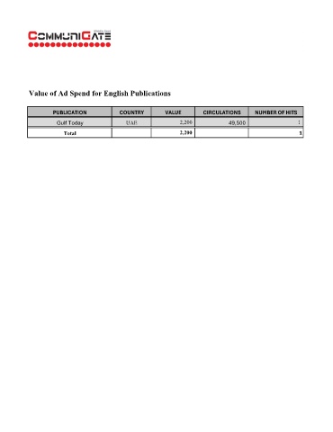 Value of Ad Spend for English Publications PUBLICATION COUNTRY VALUE CIRCULATIONS NUMBER OF HITS Gulf Today UAE 2,200 49,500 1 Total 2,200 1