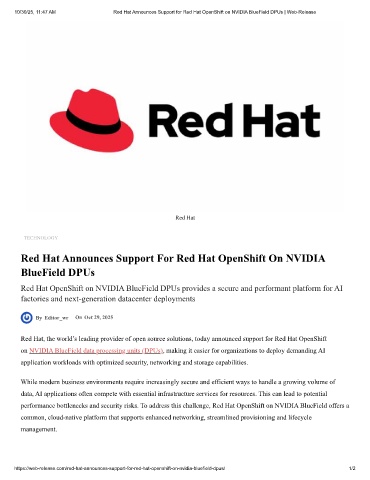10/30/25, 11:47 AM Red Hat Announces Support for Red Hat OpenShift on NVIDIA BlueField DPUs | Web-Release