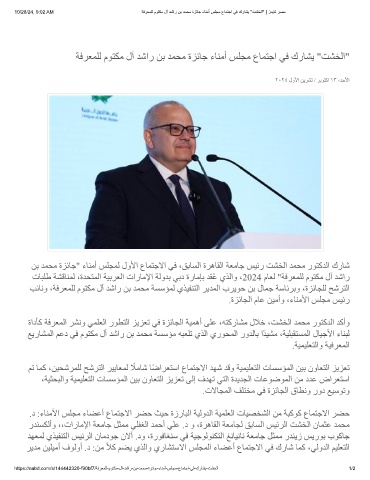 ﻦﺑ ﺪﻤﺤﻣ ةﺰﺋﺎﺟ" ءﺎﻨﻣأ ﺲﻠﺠﻤﻟ لوﻷا عﺎﻤﺘﺟﻻا ﻲﻓ ،ﻖﺑﺎﺴﻟا ةﺮھﺎﻘﻟا ﺔﻌﻣﺎﺟ ﺲﯿﺋر ﺖﺸﺨﻟا ﺪﻤﺤﻣ رﻮﺘﻛﺪﻟا كرﺎﺷ