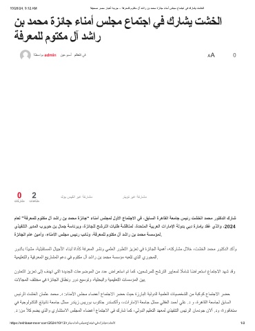10/28/24, 9:12 AM ﺔﻔﯾﺣﺻ رﺻﻣ رﺎﺑﺧأ ةدﯾرﺟ – ﺔﻓرﻌﻣﻠﻟ موﺗﻛﻣ لآ دﺷار نﺑ دﻣﺣﻣ ةزﺋﺎﺟ ءﺎﻧﻣأ سﻠﺟﻣ عﺎﻣﺗﺟا ﻲﻓ كرﺎﺷﯾ تﺷﺧﻟا