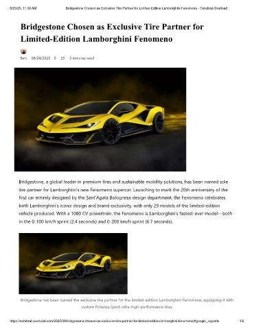 8/25/25, 11:38 AM Bridgestone Chosen as Exclusive Tire Partner for Limited-Edition Lamborghini Fenomeno - Cerebral-Overload