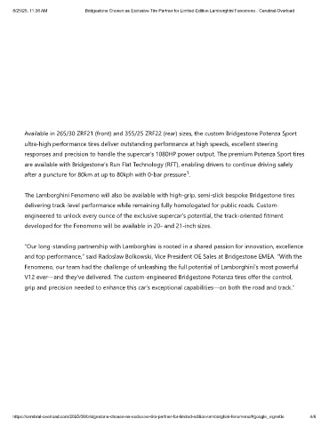 8/25/25, 11:38 AM Bridgestone Chosen as Exclusive Tire Partner for Limited-Edition Lamborghini Fenomeno - Cerebral-Overload