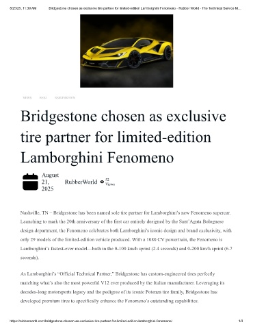 8/25/25, 11:39 AM Bridgestone chosen as exclusive tire partner for limited-edition Lamborghini Fenomeno - Rubber World - The Technical Service M…