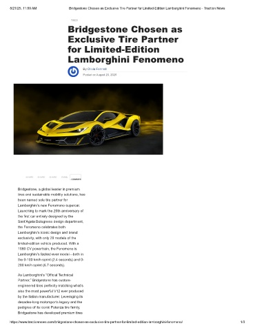 8/21/25, 11:09 AM Bridgestone Chosen as Exclusive Tire Partner for Limited-Edition Lamborghini Fenomeno - Traction News