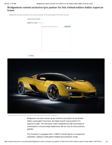 https://www.moneycontrol.com/automobile/bridgestone-named-exclusive-tyre-partner-for-this-limited-edition-italian-supercar-brand-article-13472153.ht… 1/4