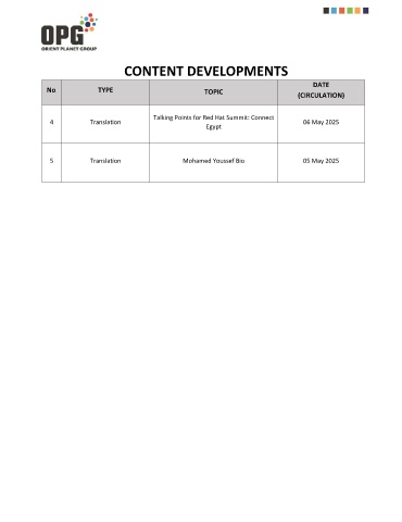 CONTENT DEVELOPMENTS DATE No. TYPE TOPIC (CIRCULATION) Talking Points for Red Hat Summit: Connect 4 Translation 06 May 2025 Egypt 5 Translation Mohamed Youssef Bio 05 May 2025