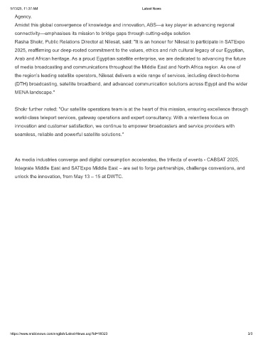 Rasha Shokr, Public Relations Director at Nilesat, said: "It is an honour for Nilesat to participate in SATExpo