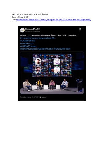 Publication: X – Broadcast Pro Middle East Date: 13 May 2025 Link: Broadcast Pro Middle East: CABSAT, Integrate ME and SATExpo Middle East begin today