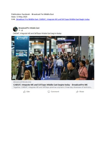 Publication: Facebook – Broadcast Pro Middle East Date: 13 May 2025 Link: Broadcast Pro Middle East: CABSAT, Integrate ME and SATExpo Middle East begin today