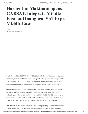 5/14/25, 1:23 PM Hasher bin Maktoum opens CABSAT, Integrate Middle East and inaugural SATExpo Middle East