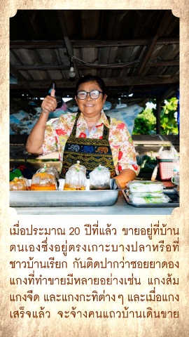 ี เมื่อประมาณ 20 ปที่แล้ว ขายอยู่ที่บ้าน ู ่ ่ ื ่ ึ ตนเองซึ่งอยตรงเกาะบางปลาหรอที ชื่าวบ้านเรียก กันติดปากว่าซึ่อยยาดอง แกงที่ทาขายมีหลายอย่างเชื่่น แกงส้ม ำ ่ แกงจืด และแกงกะทต่างๆ และเมอแกง ิ ื เสร็จแล้ว จะจ้างคนแถึวบ้านเดินขาย
