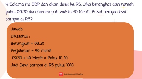 pukul 09.30 dan menempuh waktu 40 Menit. Pukul berapa dewi