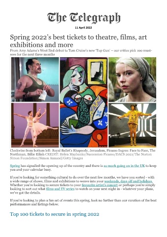 Clockwise from bottom left: Royal Ballet's Rhapsody, Jerusalem, Picasso Ingres: Face to Face, The