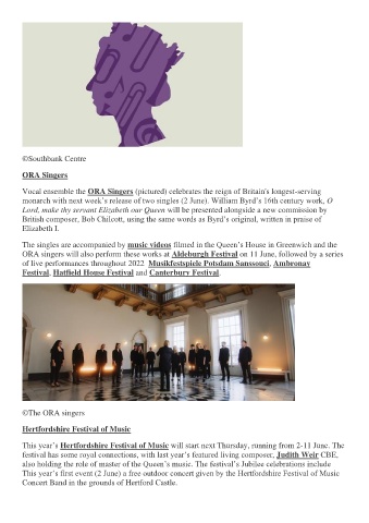 Vocal ensemble the ORA Singers (pictured) celebrates the reign of Britain's longest-serving