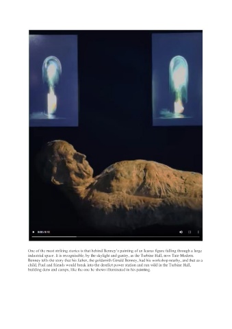 One of the most striking stories is that behind Benney’s painting of an Icarus figure falling through a large