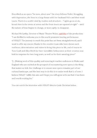 Michael McCarthy, Director of Music Theatre Wales, said this of the production: