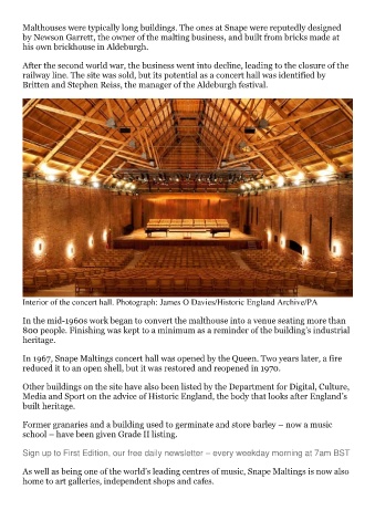 In 1967, Snape Maltings concert hall was opened by the Queen. Two years later, a fire