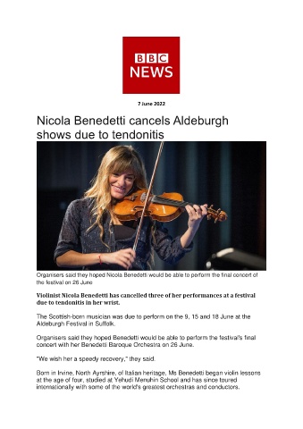 Organisers said they hoped Nicola Benedetti would be able to perform the final concert of