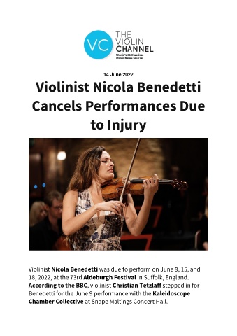 Violinist Nicola Benedetti was due to perform on June 9, 15, and