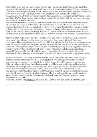 By contrast Adams’s new piece expressed a single state of breathless agitation across nearly 20