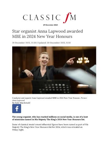 Conductor and organist Anna Lapwood awarded MBE in 2024 New Year Honours. Picture:
