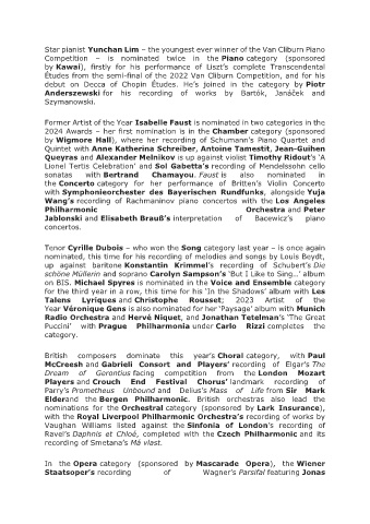 sonatas with Bertrand Chamayou. Faust is also nominated in