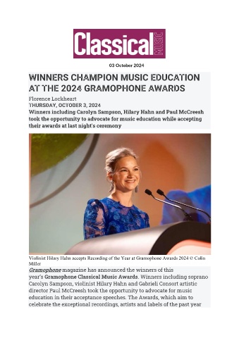 Violinist Hilary Hahn accepts Recording of the Year at Gramophone Awards 2024 © Colin
