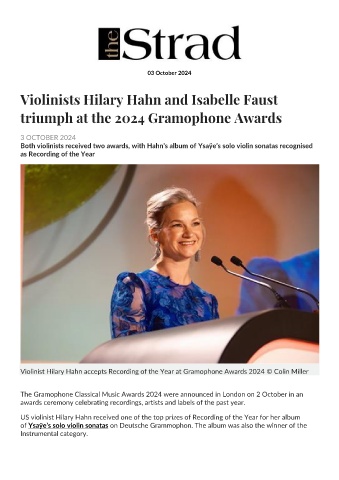 Violinist Hilary Hahn accepts Recording of the Year at Gramophone Awards 2024 © Colin Miller