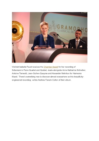 Violinist Isabelle Faust receives the Chamber Award for her recording of