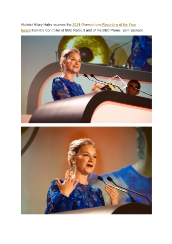 Violinist Hilary Hahn receives the 2024 Gramophone Recording of the Year Award from the Controller of BBC Radio 3 and of the BBC Proms, Sam Jackson.