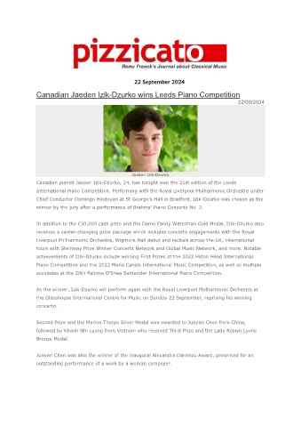 Canadian pianist Jaeden Izik-Dzurko, 24, has tonight won the 21st edition of the Leeds