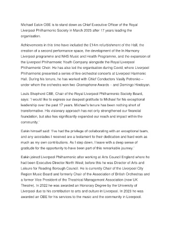 Liverpool Philharmonic Society in March 2025 after 17 years leading the