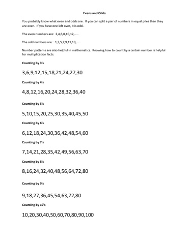 Evens and OddsYou probably know what even and odds are. If you can split a pair of numbers in equal piles than they are even. If you have one left over, it is odd.The even numbers are: 2,4,6,8,10,12,%u2026..The odd numbers are : 1,3,5,7,9,11,13,%u2026..Number patterns are also helpful in mathematics. Knowing how to count by a certain number is helpful for multiplication facts.Counting by 3%u2019s3,6,9,12,15,18,21,24,27,30Counting by 4%u2019s4,8,12,16,20,24,28,32,36,40Counting by 5%u2019s5,10,15,20,25,30,35,40,45,50Counting by 6%u2019s6,12,18,24,30,36,42,48,54,60Counting by 7%u2019s7,14,21,28,35,42,49,56,63,70Counting by 8%u2019s8,16,24,32,40,48,56,64,72,80Counting by 9%u2019s 9,18,27,36,45,54,63,72,80Counting by 10%u2019s10,20,30,40,50,60,70,80,90,100