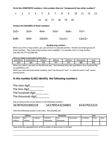 Circle the COMPOSITE numbers%u2014the numbers that are %u201ccomposed of two other numbers%u201d12345678910111213141617181920Answer the SQUARES of these numbers:2x2=3x3=4x4=5x5=6x6=7x7=8x8=9x9=10x10=11x11=12x12=Reading long numbersWhen you write along number, you use comma%u2019s to separate periods. Periods are simple groups of three numbers. They make long numbers more readable. For example, here is a long number:245,456,754,777,753,986,301Here is a larger version place value chartquintillionsquadrillionstrillionsbillionsmillionsthousandsones245456754777753986301When you read it, you start on the left and says: %u201ctwo hundred forty-five quintillions, four hundred fiftysix quadrillions, etc.When you read and write whole numbers, don%u2019t say the word %u201cand%u201d. In math the word %u201cand%u201d means decimal point.In the number 8,432 identify the following numbers:The ones digit__________The tens digit__________The hundreds digit_________The thousands digit_________Add commas to the correct places on the following numbers:36787020100021854378954323486565437653323Place the following number in the chart: 453,220,000,501millionsthousandsoneshundredmillionstenmillionsmillionshundred thousandsten thousandsthousandshundredstensonesNow write the expanded form of this number to show how it is formed:__________________________________________________________________________________________________________________________________________________________________________