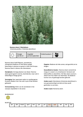 Roomse alsem / Absintalsem Artemisia pontica / Artemisia absinthiumHoogte tot 50 cmOogst%u00ddjd juni tot septemberOnderhoudsarmRoomse alsem heeft filigrane, aromatische, zilvergroene bladeren en heel kleine, gelige bloemetjes in pluimen en groeit in heel Zuid-Europa.Roomse Alsem is kleiner dan Absintalsem.Standplaats: Zonnige plaatsen zijn ideaal. Roomse alsem groeit goed in warme, doorlatende, maar ook in kalkachtige of droge grond.Verzorging: Zeer spaarzaam water en voeding geven. De plant woekert snel. Kan ook in pot of bak worden gekweekt. Vermeerdering: Delen van de wortelstok in het voorjaar, kopstekken in de zomer.Oogsten: Bladeren de hele zomer, ook geschikt om te drogen.Gezondheid en keuken: Roomse alsem versterkt de maag en is zweet- en urinedrijvend. Hij bevat veel bitterstoffen en absinthine. Het fijne alsem-aroma is ideaal voor het maken van alsemwijn. De bladeren kunnen vers of gedroogd worden gebruikt.Andere soort: Absintalsem (Artemisia absinthium) is een geneeskrachtig kruid dat als thee wordt gedronken na vet eten.Andere naam: Romeinse alant.BLOEMKLEURBLOEITIJDjanfebmaartaprilmeijunijuliaugseptoktnovdec