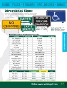 Directional Signs57Rectangular Engraved Laminated Directional SignsNo. of SidesSizeGreen/WhiteYellow/BlackPriceSingle-Sided12" W X 6" H#405880#405882$29.99 ea.Double-Sided12" W X 6" H#405883#405885$39.99 ea.Single-Sided15" W X 9" H#405886#405888$39.99 ea.Double-Sided15" W X 9" H#405889#405891$45.99 ea.Sign WordingOrder NumberCarts - Double Arrow01Carts - Left Arrow02Carts - Right Arrow03No Carts Beyond Here04No Carts05Carts Scatter06Keep Carts 30 Feet From Green07No Carts Beyond This Point08Keep Carts On Path09Cart Path Only This Hole10Scatter12Please Repair Ball Marks13Ground Under Repair15Replace Divots17Please Keep Off18Tee Closed22Putting Green Closed24Chemicals Applied Today25Easy to read, long-lasting laminate signs are available in 2 popular standard colors. All signs can be single-sided or double-sided. Complete with two 5" steel spikes. For custom wording, colors andlanguages, please call.Example: Green/White Single Sided 12" x 6" - No Carts - 405880-05 Handicap Sign 15" x 9"#400852 - Single Sided - $39.99 ea.#400853 - Double Sided - $49.99 ea.Sign WordingOrder NumberNo Chipping28Putting Only29Drop Area3090ยบ Rule31Irons Only32Lessons Only33Range Closed34Mats Only35Next Tee (Right Arrow)36Next Tee (Left Arrow)37Hole 1 (Left Arrow)38Hole 1 (Right Arrow)39Hole 10 (Left Arrow)40Hole 10 (Right Arrow)41Bag Drop (Left Arrow)42Bag Drop (Right Arrow)43Bag Drop (Up Arrow)44Bag Drop45Custom Color/Sign#400851 - Call For Pricing
