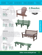 71Maintenance free and made with recycled material. Each model is heavy duty and designed for comfort. Available in a variety of sizes and designs to ft your needs. BenchesHigh Back BenchModel features fat seating with back support and includes stainless steel hardware. Mall BenchModel features fat seating and includes stainless steel hardware. Heritage BenchThe 6' Heritage Bench offers comfort and style and requires minimal maintenance. Made from 100% recycled plastic lumber, the Heritage will never chip, rot, split or need painting. Modeled after traditional wood benches, this recycled plastic lumber bench offers the best in style and durability. The seat area is contoured for comfort and arm rests are convenient when relaxing.Colorfilled custom wording may be possible - please call to discuss.#T245G - Green #T245BRN - Brown #T245BLK - Black Price - $799.99 ea.Adirondack ChairThis great looking 100% recycled plastic Adirondack Chair is priced for every budget. Perfect for ranges and clubhouses it will never need painting and requires zero maintenance.#C428G - Green #C428BRN - Brown #C428BLK - Black Price - $350.99 ea.6 Foot#405510 - Green #405511 - Brown #405512 - Black Price - $639.99 ea.6 Foot#405530 - Green #405531 - Brown #405532 - Black Price - $420.99 ea.4 Foot#405500 - Green #405501 - Brown #405502 - Black Price - $469.99 ea.4 Foot#405520 - Green #405521 - Brown #405522 - Black Price - $299.99 ea.