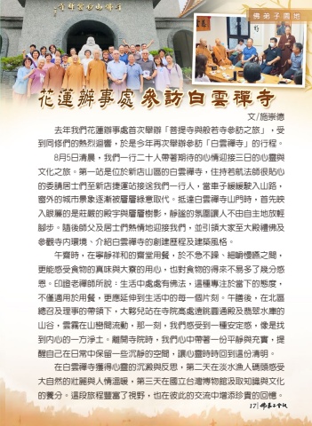 %u3000%u3000%u53bb%u5e74%u6211%u5011%u82b1%u84ee%u8fa6%u4e8b%u8655%u9996%u6b21%u8209%u8fa6%u300c%u83e9%u63d0%u5bfa%u8207%u822c%u82e5%u5bfa%u53c3%u8a2a%u4e4b%u65c5%u300d%uff0c%u53d7%u5230%u540c%u4fee%u5011%u7684%u71b1%u70c8%u8ff4%u97ff%uff0c%u65bc%u662f%u4eca%u5e74%u518d%u6b21%u8209%u8fa6%u53c3%u8a2a%u300c%u767d%u96f2%u79aa%u5bfa%u300d%u7684%u884c%u7a0b%u3002%u3000%u30008%u67085%u65e5%u6e05%u6668%uff0c%u6211%u5011%u4e00%u884c%u4e8c%u5341%u4eba%u5e36%u8457%u671f%u5f85%u7684%u5fc3%u60c5%u8fce%u63a5%u4e09%u65e5%u7684%u5fc3%u9748%u8207%u6587%u5316%u4e4b%u65c5%u3002%u7b2c%u4e00%u7ad9%u662f%u4f4d%u65bc%u65b0%u5e97%u5c71%u5340%u7684%u767d%u96f2%u79aa%u5bfa%uff0c%u4f4f%u6301%u82e5%u822a%u6cd5%u5e2b%u5f88%u8cbc%u5fc3%u7684%u59d4%u8acb%u5c45%u58eb%u5011%u81f3%u65b0%u5e97%u6377%u904b%u7ad9%u63a5%u9001%u6211%u5011%u4e00%u884c%u4eba%uff0c%u7576%u8eca%u5b50%u7de9%u7de9%u99db%u5165%u5c71%u8def%uff0c%u7a97%u5916%u7684%u57ce%u5e02%u666f%u8c61%u9010%u6f38%u88ab%u5c64%u5c64%u7da0%u610f%u53d6%u4ee3%u3002%u62b5%u9054%u767d%u96f2%u79aa%u5bfa%u5c71%u9580%u6642%uff0c%u9996%u5148%u6620%u5165%u773c%u7c3e%u7684%u662f%u838a%u56b4%u7684%u6bbf%u5b87%u8207%u5c64%u5c64%u6a39%u5f71%uff0c%u975c%u8b10%u7684%u6c1b%u570d%u8b93%u4eba%u4e0d%u7531%u81ea%u4e3b%u5730%u653e%u8f15%u8173%u6b65%u3002%u96a8%u5f8c%u5e2b%u7236%u53ca%u5c45%u58eb%u5011%u71b1%u60c5%u5730%u8fce%u63a5%u6211%u5011%uff0c%u4e26%u5f15%u9818%u5927%u5bb6%u81f3%u5927%u6bbf%u79ae%u4f5b%u53ca%u53c3%u89c0%u5bfa%u5167%u74b0%u5883%u3001%u4ecb%u7d39%u767d%u96f2%u79aa%u5bfa%u7684%u5275%u5efa%u6b77%u7a0b%u53ca%u5efa%u7bc9%u98a8%u683c%u3002%u3000%u3000%u5348%u9f4b%u6642%uff0c%u5728%u5be7%u975c%u7965%u548c%u7684%u9f4b%u5802%u7528%u9910%uff0c%u65bc%u4e0d%u6025%u4e0d%u8e81%u3001%u7d30%u56bc%u6162%u56a5%u4e4b%u9593%uff0c%u66f4%u80fd%u611f%u53d7%u98df%u7269%u7684%u771f%u5473%u8207%u5927%u5bee%u7684%u7528%u5fc3%uff0c%u4e5f%u5c0d%u98df%u7269%u7684%u5f97%u4f86%u4e0d%u6613%u591a%u4e86%u5e7e%u5206%u611f%u6069%u3002%u5370%u8b49%u8001%u79aa%u5e2b%u6240%u8aaa%uff1a%u751f%u6d3b%u4e2d%u8655%u8655%u6709%u4f5b%u6cd5%uff0c%u9019%u7a2e%u5c08%u6ce8%u65bc%u7576%u4e0b%u7684%u614b%u5ea6%uff0c%u4e0d%u50c5%u9069%u7528%u65bc%u7528%u9910%uff0c%u66f4%u61c9%u5ef6%u4f38%u5230%u751f%u6d3b%u4e2d%u7684%u6bcf%u4e00%u500b%u7247%u523b%u3002%u5348%u81b3%u5f8c%uff0c%u5728%u5317%u5340%u7e3d%u53ec%u53ca%u7406%u4e8b%u7684%u5e36%u9818%u4e0b%uff0c%u5927%u5925%u5152%u7ad9%u5728%u5bfa%u9662%u9ad8%u8655%u9060%u773a%u5713%u901a%u6bbf%u53ca%u7fe1%u7fe0%u6c34%u5eab%u7684%u5c71%u8c37%uff0c%u96f2%u9727%u5728%u5c71%u5dd2%u9593%u6d41%u52d5%uff0c%u90a3%u4e00%u523b%uff0c%u6211%u5011%u611f%u53d7%u5230%u4e00%u7a2e%u5b89%u5b9a%u611f%uff0c%u50cf%u662f%u627e%u5230%u5167%u5fc3%u7684%u4e00%u65b9%u6de8%u571f%u3002%u96e2%u958b%u5bfa%u9662%u6642%uff0c%u6211%u5011%u5fc3%u4e2d%u5e36%u8457%u4e00%u4efd%u5e73%u975c%u8207%u5145%u5be6%uff0c%u63d0%u9192%u81ea%u5df1%u5728%u65e5%u5e38%u4e2d%u4fdd%u7559%u4e00%u4e9b%u6c89%u975c%u7684%u7a7a%u9593%uff0c%u8b93%u5fc3%u9748%u6642%u6642%u56de%u5230%u9019%u4efd%u6e05%u660e%u3002%u3000%u3000%u5728%u767d%u96f2%u79aa%u5bfa%u7372%u5f97%u5fc3%u9748%u7684%u6c89%u6fb1%u8207%u53cd%u601d%uff0c%u7b2c%u4e8c%u5929%u5728%u6de1%u6c34%u6f01%u4eba%u78bc%u982d%u611f%u53d7%u5927%u81ea%u7136%u7684%u58ef%u9e97%u8207%u4eba%u60c5%u6eab%u6696%uff0c%u7b2c%u4e09%u5929%u5728%u570b%u7acb%u53f0%u7063%u535a%u7269%u9928%u6c72%u53d6%u77e5%u8b58%u8207%u6587%u5316%u7684%u990a%u5206%u3002%u9019%u6bb5%u65c5%u7a0b%u8c50%u5bcc%u4e86%u8996%u91ce%uff0c%u4e5f%u5728%u5f7c%u6b64%u7684%u4ea4%u6d41%u4e2d%u589e%u6dfb%u73cd%u8cb4%u7684%u56de%u61b6%u3002%u6587/%u65bd%u5d07%u5fb717|%u4f5b%u5f1f%u5b50%u5712%u5730
