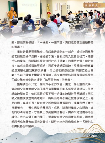 %u958b%uff0c%u537b%u4e5f%u6709%u4e9b%u61f7%u7591%uff1a%u300c%u4e00%u6839%u91dd%uff0c%u4e00%u500b%u7a74%u9053%uff0c%u771f%u7684%u80fd%u5920%u505a%u5230%u9019%u9ebc%u795e%u5947%u7684%u4e8b%u55ce%uff1f%u300d%u3000%u3000%u5be6%u4f5c%u6642%u9593%u662f%u9019%u5834%u8b1b%u5ea7%u4e2d%u6211%u5370%u8c61%u6700%u6df1%u523b%u7684%u4e00%u90e8%u5206%uff1a%u64d4%u4efb%u5354%u540c%u6559%u5b78%u7684%u8001%u5e2b%u89aa%u81ea%u64cd%u4f5c%u637b%u8f49%u3001%u63d0%u63d2%u7684%u624b%u6cd5%u3002%u7576%u91dd%u5c16%u523a%u5165%u6211%u7684%u5408%u8c37%u7a74%uff0c%u96a8%u8457%u624b%u6cd5%u7684%u64cd%u4f5c%uff0c%u6211%u660e%u986f%u611f%u53d7%u5230%u4fee%u9580%u91dd%u6cd5%u300c%u5f97%u6c23%u300d%u7684%u7368%u7279%u611f%u89ba%u3002%u7576%u91dd%u523a%u5f8c%uff0c%u6c23%u611f%u7531%u5c40%u90e8%u64f4%u6563%u81f3%u7d93%u7d61%uff0c%u518d%u9010%u6b65%u901a%u904e%u95dc%u7bc0%u6642%uff0c%u90a3%u7a2e%u5fae%u5999%u4f46%u771f%u5be6%u7684%u6c23%u6d41%u8b8a%u5316%u8b93%u6211%u9a5a%u8a1d%u53c8%u8208%u596e%uff0c%u800c%u4e5f%u80fd%u660e%u986f%u611f%u53d7%u5230%u91dd%u523a%u90e8%u4f4d%u767c%u51fa%u5bd2%u6c23%u3002%u5148%u524d%u7684%u8ab2%u5802%u4e0a%u5b78%u7fd2%u591a%u662f%u7406%u8ad6%uff0c%u9019%u6b21%u5be6%u969b%u64cd%u4f5c%u5247%u8b93%u6211%u6df1%u523b%u611f%u53d7%u5230%u4e86%u5e2b%u7236%u8b1b%u5ea7%u7576%u4e2d%u6578%u6b21%u63d0%u5230%u300c%u6c23%u81f3%u800c%u6709%u6548%u300d%u7684%u610f%u7fa9%u3002%u3000%u3000%u6574%u5834%u8b1b%u5ea7%u4e0d%u53ea%u662f%u4e00%u5834%u91dd%u7078%u624b%u6cd5%u7684%u5b78%u7fd2%uff0c%u66f4%u662f%u4e00%u5834%u5fc3%u9748%u7684%u6d17%u6ecc%u3002%u6167%u5bc2%u5e2b%u7236%u8207%u5875%u7fa9%u5e2b%u7236%u70ba%u4e86%u8b93%u6240%u6709%u540c%u5b78%u76e1%u53ef%u80fd%u591a%u611f%u53d7%u9019%u9805%u91dd%u6cd5%uff0c%u5373%u4fbf%u8d95%u8eca%u6642%u9593%u5728%u5373%uff0c%u4f9d%u7136%u6293%u7dca%u77ed%u66ab%u4e0d%u5230%u4e00%u5206%u9418%u7684%u6642%u9593%u66ff%u540c%u5b78%u8b1b%u89e3%uff01%u5169%u4f4d%u5e2b%u7236%u98a8%u5875%u50d5%u50d5%u9060%u5f9e%u9ad8%u96c4%u8d95%u4f86%uff0c%u5c07%u6240%u6709%u6642%u9593%u90fd%u7528%u5728%u63d0%u651c%u5f8c%u8f29%u4e4b%u4e0a%uff0c%u6148%u60b2%u5fc3%u8178%uff0c%u83ab%u904e%u5982%u662f%u3002%u6167%u5bc2%u5e2b%u7236%u5c07%u4f5b%u7406%u8207%u91ab%u7406%u878d%u5408%uff0c%u63d0%u9192%u6211%u5011%u300c%u990a%u751f%u9996%u91cd%u990a%u5fc3%u300d%uff0c%u990a%u751f%u61c9%u5f9e%u57f9%u990a%u6148%u60b2%u3001%u611f%u6069%u3001%u96a8%u559c%u8207%u61fa%u6094%u4e4b%u5fc3%u958b%u59cb%uff0c%u552f%u6709%u5167%u5fc3%u6e05%u6de8%u6148%u60b2%uff0c%u624d%u80fd%u771f%u6b63%u505a%u5230%u91ab%u75c5%u4e5f%u91ab%u5fc3%u3002%u8207%u5e2b%u7236%u77ed%u77ed%u5169%u5c0f%u6642%u7684%u7de3%u5206%u5728%u6211%u5fc3%u4e2d%u64ad%u4e0b%u5584%u7684%u7a2e%u5b50%uff0c%u900f%u904e%u6167%u5bc2%u5e2b%u7236%u7684%u6db5%u990a%u8207%u98a8%u7bc4%uff0c%u8b93%u6211%u91cd%u65b0%u601d%u8003%u6210%u70ba%u91ab%u8005%u7684%u521d%u5fc3%u8207%u8cac%u4efb%uff0c%u671f%u8a31%u672a%u4f86%u81ea%u5df1%u4e5f%u80fd%u6210%u70ba%u4e00%u540d%u61f7%u62b1%u4ec1%u5fc3%u8207%u6280%u85dd%u7684%u4e2d%u91ab%u5e2b%u300221|%u5065%u5eb7%u65b0%u98df%u4ee3