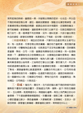 %u7a81%u7136%u8d77%u8eab%u7684%u6642%u5019%uff0c%u6703%u773c%u524d%u4e00%u9ed1%u3002%u624b%u8173%u6613%u51fa%u73fe%u9ebb%u7684%u75c7%u72c0%u3002%u5fc3%u4e3b%u8840%uff0c%u6240%u4ee5%u8840%u4e0d%u5920%u7684%u6642%u5019%u5bb9%u6613%u5fc3%u60b8%u3001%u5065%u5fd8%uff0c%u7761%u7720%u54c1%u8cea%u8b8a%u5dee%u3002%u982d%u9aee%u6c92%u5149%u6fa4%u5bb9%u6613%u6389%u843d%u3002%u5f88%u591a%u7522%u5a66%u5bb9%u6613%u51fa%u73fe%u6389%u9aee%u7684%u554f%u984c%uff0c%u90fd%u8ddf%u8840%u6db2%u7684%u6d41%u5931%u6709%u95dc%u4fc2%u3002%u820c%u982d%u984f%u8272%u504f%u6de1%u3002%u8108%u53ef%u80fd%u504f%u7d30%uff0c%u8108%u7ba1%u504f%u7d30%u3002%u6fc7%u8108%u662f%u640f%u624b%u7684%u5f35%u529b%u6bd4%u8f03%u4e0d%u8db3%uff0c%u5728%u8108%u8840%u88e1%u9762%u5f62%u5982%u8f15%u5200%u522e%u7af9%uff0c%u662f%u4e00%u500b%u6eef%u6f80%u4e0d%u5229%u7684%u73fe%u8c61%u3002%u53e6%u5916%u4e00%u500b%u53eb%u82a4%u8108%uff0c%u5927%u90e8%u5206%u6703%u51fa%u73fe%u5728%u5931%u8840%u7684%u904e%u7a0b%uff0c%u8108%u7ba1%u5982%u6309%u8525%u7ba1%uff0c%u5c31%u662f%u8f15%u6309%u4e0a%u4e0b%u6709%u8108%uff0c%u4f46%u4e2d%u9593%u4e00%u6bb5%u662f%u7a7a%u7684%u3002%u25ce%u5c0d%u8b49%u88dc%u990a%u8655%u65b9%uff1a%u88dc%u8840%u7684%u56db%u7269%u6e6f%uff0c%u53ea%u8981%u7b26%u5408%u8840%u865b%u7684%u7537%u5973%u751f%u90fd%u53ef%u4ee5%u7528%u3002%u6709%u4e00%u4e9b%u9577%u8005%uff0c%u51ac%u5b63%u5bb9%u6613%u51fa%u73fe%u76ae%u819a%u7662%uff0c%u7662%u7684%u5730%u65b9%u6703%u4e7e%u71e5%uff0c%u751a%u81f3%u6414%u6293%u6703%u5f88%u591a%u76ae%u5c51%uff0c%u4e2d%u91ab%u7a31%u70ba%u8840%u865b%u751f%u98a8%u3002%u4e5f%u5c31%u662f%u8840%u4e0d%u8db3%u6c92%u6709%u6ecb%u990a%u76ae%u819a%u3002%u56db%u5473%u85e5%u5c31%u662f%u7576%u6b78%u3001%u719f%u5730%u3001%u767d%u828d%u3001%u5ddd%u828e%u3002%u7576%u6b78%u542b%u6709%u63ee%u767c%u6027%u6210%u5206%u7684%u7cbe%u6cb9%uff0c%u7528%u4e00%u4e9b%u9152%u7a0d%u5fae%u6d78%u4e00%u4e0b%uff0c%u8b93%u63ee%u767c%u6027%u6210%u5206%u5bb9%u6613%u91cb%u653e%u51fa%u4f86%u3002%u4e3b%u8981%u88dc%u8840%u7684%u85e5%u6750%u662f%u719f%u5730%u3002%u50b3%u7d71%u719f%u5730%u662f%u7d93%u904e%u4e00%u9053%u7279%u6b8a%u7684%u70ae%u88fd%u7a0b%u5e8f%uff0c%u7a31%u70ba%u4e5d%u84b8%u4e5d%u66ec%u3002%u5b83%u662f%u628a%u63a1%u6536%u56de%u4f86%u7684%u5730%u9ec3%u7528%u9ec3%u9152%u6d78%u6ce1%u4ee5%u5f8c%u7528%u84b8%uff0c%u4e4b%u5f8c%u518d%u628a%u5b83%u62ff%u51fa%u53bb%u65e5%u66ec%uff0c%u8981%u53cd%u5fa9%u4e5d%u6b21%u3002%u6240%u4ee5%u719f%u5730%u7d93%u904e%u9019%u6a23%u7684%u8655%u7406%u4ee5%u5f8c%uff0c%u6ecb%u990a%u7684%u6210%u5206%u6703%u6fc3%u7e2e%u5728%u88e1%u9762%uff0c%u4e00%u822c%u7684%u85e5%u81b3%u53ea%u8981%u52a0%u4e86%u719f%u5730%uff0c%u6e6f%u982d%u6703%u8b8a%u5f97%u6bd4%u8f03%u6fc3%u6fc3%u9ed1%u9ed1%uff0c%u6ecb%u990a%u7684%u4f5c%u7528%u6bd4%u8f03%u5927%u3002%u767d%u828d%u7528%u7092%u904e%u7684%uff0c%u7a0d%u5fae%u5e36%u6536%u6582%u4f5c%u7528%uff0c%u8eab%u9ad4%u6709%u4e00%u4e9b%u904e%u5ea6%u5916%u6563%u7684%u8840%u6d41%uff0c%u9069%u5ea6%u7684%u7a0d%u5fae%u6536%u6582%u3002%u53e6%u4e00%u500b%u85e5%u6750%u53eb%u5ddd%u828e%uff0c%u5b83%u525b%u8ddf%u767d%u828d%u76f8%u53cd%uff0c%u5e36%u6709%u884c%u8840%u4f5c%u7528%u3002%u6545%u7576%u6b78%u548c%u8840%uff0c%u719f%u5730%u88dc%u8840%uff0c%u767d%u828d%u6582%u8840%uff0c%u5ddd%u828e%u6d3b%u8840%u3002%u4e09%u3001%u9670%u865b%uff1a%u9670%u5728%u5167%uff0c%u967d%u5728%u5916%uff0c%u5728%u5167%u90e8%u7684%u9670%u6bd4%u8f03%u4e0d%u5920%u7684%u6642%u5019%u5916%u90e8%u7684%u967d%u71b1%u5c31%u5e72%u64fe%u5230%u5167%u90e8%u9670%u7684%u5c64%u6b21%uff0c%u5373%u9670%u865b%u751f%u5167%u71b1%u3002%u6f6e%u71b1%uff0c%u76dc%u6c57(%u7279%u5225%u5728%u7761%u7720%u4e2d)%uff0c%u4e94%u5fc3%u7169%u71b1%uff0c%u5c31%u662f%u5169%u500b%u624b%u5fc3%uff0c%u5169%u500b%u8173%u5fc3%u6703%u71b1%uff0c%u518d%u52a0%u4e0a%u6211%u5011%u771f%u6b63%u7684%u5fc3%u4e2d%u6703%u7169%u71e5%uff0c%u4e0b%u5348%u904e%u5f8c%u9874%u9aa8%u81c9%u9830%u5340%u6613%u7d05%u3002%u5f62%u9ad4%u6d88%u7626%uff0c%u54bd%u4e7e%u53e3%u71e5%uff0c%u7729%u6688%u5931%u7720%uff0c%u5c0f%u4fbf%u7684%u91cf%u6703%u6bd4%u8f03%u5c11%uff0c%u984f%u8272%u6703%u504f%u9ec3%uff0c%u5927%u4fbf%u504f%u4e7e%u786c%uff0c%u820c%u982d%u504f%u7d05%uff0c%u820c%u82d4%u5c11%uff0c%u8a3a%u8108%u7684%u6642%u5019%uff0c%u8108%u7ba1%u6703%u6bd4%u8f03%u504f%u7d30%uff0c%u6578%u8108%u6703%u8df3%u6bd4%u8f03%u5feb%uff0c%u5e38%u5e38%u90fd%u572880%u4ee5%u4e0a%u300223|%u5065%u5eb7%u65b0%u98df%u4ee3