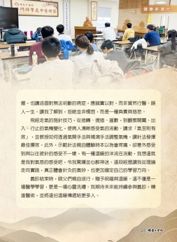 %u63e1%uff0c%u4e5f%u8b1b%u8ff0%u9762%u5c0d%u7121%u6cd5%u5224%u65b7%u7684%u75c5%u75c7%uff0c%u61c9%u8aa0%u5be6%u4ee5%u5c0d%uff0c%u800c%u975e%u8cbf%u7136%u884c%u91ab%u3001%u8aa4%u4eba%u4e00%u751f%u3002%u8b93%u6211%u4e86%u89e3%u5230%uff0c%u62d2%u7d55%u4e26%u975e%u61e6%u5f31%uff0c%u800c%u662f%u4e00%u7a2e%u8ca0%u8cac%u8207%u6148%u60b2%u3002%u3000%u3000%u98db%u7d93%u8d70%u6c23%u7684%u65bd%u91dd%u6280%u5de7%uff0c%u5f9e%u637b%u8f49%u3001%u63d0%u63d2%u3001%u9072%u6578%uff0c%u5230%u89c0%u5bdf%u958b%u95d4%u3001%u51fa%u5165%u3001%u884c%u6b62%u7684%u6c23%u6a5f%u8b8a%u5316%uff0c%u4f7f%u75c5%u4eba%u6e05%u6670%u611f%u53d7%u6c23%u7684%u6d41%u52d5%u3002%u8b1b%u6c42%u300c%u6c23%u81f3%u5247%u6709%u6548%u300d%uff0c%u4e26%u6559%u6388%u5982%u4f55%u900f%u904e%u6c23%u958b%u624b%u6cd5%u8207%u88dc%u7009%u624b%u6cd5%u8abf%u6574%u6c23%u6a5f%uff0c%u8b93%u91dd%u6cd5%u767c%u63ee%u6700%u4f73%u7642%u6548%u3002%u6b64%u5916%uff0c%u793a%u7bc4%u91dd%u6cd5%u89aa%u81ea%u9ad4%u9a57%u6642%u672c%u4ee5%u70ba%u6703%u75bc%u75db%uff0c%u537b%u610f%u5916%u611f%u53d7%u5230%u8207%u4ee5%u5f80%u88ab%u91dd%u7684%u611f%u53d7%u4e0d%u4e00%u6a23%uff0c%u6709%u4e00%u7a2e%u6eab%u6696%u7684%u6d0b%u6d41%u5728%u6d41%u52d5%uff0c%u6211%u60f3%u9019%u5c31%u662f%u6211%u5c0d%u6c23%u611f%u7684%u611f%u53d7%u5427%uff0c%u4ee4%u6211%u9a5a%u5606%u4e26%u5fc3%u9189%u795e%u8ff7%u3002%u9019%u6bb5%u7d93%u6b77%u8b93%u6211%u5f9e%u7406%u8ad6%u8d70%u5411%u5be6%u8e10%uff0c%u771f%u6b63%u9ad4%u6703%u91dd%u7078%u7684%u5967%u5999%uff0c%u4e5f%u66f4%u52a0%u78ba%u5b9a%u81ea%u5df1%u7684%u5b78%u7fd2%u65b9%u5411%u3002%u3000%u3000%u7fa9%u8a3a%u7d50%u675f%u6642%uff0c%u5e2b%u7236%u5011%u89aa%u81ea%u9001%u884c%uff0c%u8d08%u4e88%u795d%u798f%u8207%u6eab%u6696%u3002%u9019%u4e0d%u50c5%u662f%u4e00%u5834%u91ab%u5b78%u5b78%u7fd2%uff0c%u66f4%u662f%u4e00%u5834%u5fc3%u9748%u6d17%u79ae%u3002%u6211%u671f%u5f85%u672a%u4f86%u80fd%u6301%u7e8c%u53c3%u8207%u7fa9%u8a3a%uff0c%u7cbe%u9032%u91ab%u8853%uff0c%u4e26%u5c07%u9019%u4efd%u6eab%u6696%u50b3%u905e%u7d66%u66f4%u591a%u4eba%u300227|%u5065%u5eb7%u65b0%u98df%u4ee3