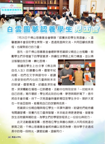%u3000%u30007%u670826%u65e5%u5343%u4f5b%u5c71%u6148%u5584%u57fa%u91d1%u6703%u8209%u8fa6%u300c%u8a8d%u990a%u6276%u52a9%u5b78%u751f%u898b%u9762%u6703%u300d%uff0c%u6eab%u99a8%u9080%u8acb%u672c%u6703%u53d7%u52a9%u5b78%u751f%u9f4a%u805a%u4e00%u5802%uff0c%u900f%u904e%u898b%u9762%u8207%u4ea4%u6d41%uff0c%u5171%u540c%u56de%u9867%u6210%u9577%u6b77%u7a0b%uff0c%u4e5f%u51dd%u805a%u524d%u884c%u7684%u529b%u91cf%u3002%u3000%u3000%u9996%u5148%uff0c%u7531%u5343%u4f5b%u5c71%u6148%u5584%u57fa%u91d1%u6703%u7e3d%u5e79%u4e8b%u82e5%u5d34%u5e2b%u7236%u89aa%u81ea%u4e0a%u53f0%u52c9%u52f5%uff0c%u9f13%u52f5%u5b78%u751f%u5011%u73cd%u60dc%u7576%u4e0b%u7684%u5b78%u7fd2%u8cc7%u6e90%uff0c%u6301%u7e8c%u5728%u6c42%u5b78%u8def%u4e0a%u52aa%u529b%u7cbe%u9032%uff0c%u4e26%u4ee5%u4f5b%u6cd5%u667a%u6167%u81ea%u6211%u5f15%u5c0e%u3001%u8f49%u5316%u56f0%u5883%u3002%u3000%u3000%u63a5%u7e8c%u7531%u5b78%u751f%u4e0a%u53f0%u5206%u4eab%u300a%u4f5b%u6cd5%u8207%u81ea%u5728%u4eba%u751f%u300b%u7684%u8b80%u66f8%u5fc3%u5f97%uff0c%u5118%u7ba1%u5e74%u7d00%u5c1a%u8f15%uff0c%u4ed6%u5011%u5728%u6587%u5b57%u8207%u8a9e%u53e5%u4e2d%uff0c%u90fd%u8b93%u4eba%u611f%u53d7%u5230%u4ed6%u5011%u5167%u5fc3%u7684%u529b%u91cf%u8207%u5c0d%u672a%u4f86%u7684%u76fc%u671b%uff0c%u5118%u7ba1%u9752%u6f80%uff0c%u537b%u860a%u542b%u6df1%u523b%u7701%u601d%uff0c%u6df1%u6df1%u89f8%u52d5%u5728%u5834%u6bcf%u4e00%u4f4d%u8046%u807d%u8005%u3002%u6d3b%u52d5%u4e2d%u4e5f%u7279%u5225%u5b89%u6392%u300c%u4e00%u5c01%u7d66%u672a%u4f86%u81ea%u5df1%u7684%u4fe1%u300d%u5beb%u4f5c%u74b0%u7bc0%uff0c%u5b78%u751f%u5c07%u6b64%u523b%u7684%u5fc3%u60c5%u3001%u5922%u60f3%u8207%u671f%u8a31%u5beb%u4e0b%uff0c%u4fe1%u4ef6%u5c07%u7531%u672c%u6703%u73cd%u85cf%uff0c%u5f85%u4e0b%u4e00%u6b21%u898b%u9762%u6703%u6642%u91cd%u65b0%u5bc4%u56de%u81f3%u5b78%u751f%u624b%u4e2d%uff0c%u671f%u8a31%u5927%u5bb6%u5728%u4e00%u5e74%u5f8c%u56de%u9996%u6642%uff0c%u80fd%u770b%u898b%u81ea%u5df1%u7684%u6539%u8b8a%u8207%u6210%u9577%u3002%u3000%u3000%u82e5%u5d34%u5e2b%u7236%u4e5f%u89aa%u81ea%u8d08%u8207%u6bcf%u4f4d%u5b78%u751f%u4e00%u672c%u8ab2%u5916%u8b80%u7269%uff0c%u76fc%u671b%u4ed6%u5011%u80fd%u6301%u7e8c%u6709%u95b1%u8b80%u7fd2%u6163%uff0c%u57f9%u990a%u5167%u5728%u529b%u91cf%u8207%u667a%u6167%uff0c%u672a%u4f86%u80fd%u8d70%u5f97%u66f4%u9060%u66f4%u7a69%u3002%u63a5%u8457%u767c%u653e%u751f%u6d3b%u7269%u8cc7%u8207%u88dc%u52a9%u91d1%uff0c%u70ba%u5b78%u751f%u5011%u7684%u5b78%u7fd2%u65c5%u7a0b%u6dfb%u4e0a%u4e00%u4efd%u5b89%u5fc3%u8207%u52a9%u529b%u3002%u3000%u3000%u6b64%u6b21%u6d3b%u52d5%u5713%u6eff%u843d%u5e55%uff0c%u611f%u6069%u6bcf%u4f4d%u5b78%u751f%u8207%u5584%u5fc3%u6350%u6b3e%u4eba%u5171%u540c%u6210%u5c31%u9019%u4efd%u6559%u80b2%u4e4b%u8def%u3002%u5343%u4f5b%u5c71%u6148%u5584%u57fa%u91d1%u6703%u5c07%u6301%u7e8c%u4ee5%u6148%u60b2%u70ba%u61f7%uff0c%u966a%u4f34%u5b78%u5b50%u8d70%u904e%u6210%u9577%u4e2d%u7684%u6bcf%u4e00%u6bb5%u6642%u5149%uff0c%u8b93%u611b%u5ef6%u7e8c%uff0c%u6eab%u6696%u540c%u884c%u300230|