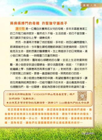 %u3000%u82e5%u60a8%u5468%u906d%u6709%u985e%u4f3c%u7684%u6025%u96e3%u500b%u6848%uff0c%u8acb%u60a8%u901a%u77e5%u6025%u96e3%u5bb6%u5ead%u8207%u6211%u5011%u9023%u7d61%uff0c%u57fa%u91d1%u6703%u5e0c%u671b%u80fd%u5920%u6df1%u5165%u793e%u5340%u95dc%u61f7%u6bcf%u500b%u9670%u6697%u89d2%u843d%uff0c%u907f%u514d%u4e0d%u5e78%u4e8b%u4ef6%u7684%u767c%u751f%uff0c%u9080%u8acb%u60a8%u5171%u540c%u4f86%u76e1%u4e00%u5206%u5fc3%u529b%uff0c%u5e6b%u52a9%u66f4%u591a%u4e0d%u5e78%u7684%u5bb6%u5ead%u3002%u57fa%u91d1%u6703%u80fd%u6eab%u99a8%u9001%u6696%uff0c%u56e0%u70ba%u6709%u60a8%uff0c%u8b93%u4ed6%u5011%u5728%u9762%u81e8%u96e3%u95dc%u6642%u5f97%u4ee5%u63d0%u8d77%u52c7%u6c23%u5411%u524d%u884c%u2026%u8207%u75c5%u75db%u640f%u9b25%u7684%u6bcd%u89aa %u4ecd%u5805%u5f37%u5b88%u8b77%u5b69%u5b50%u6e6f%uff2f%u73b2%u662f%u4e00%u4f4d%u7368%u81ea%u6276%u990a%u5169%u540d%u5973%u5152%u7684%u6bcd%u89aa%uff0c%u591a%u5e74%u4f86%u9760%u8457%u6e05%u6f54%u5de5%u7684%u5de5%u4f5c%u52c9%u529b%u7dad%u6301%u5bb6%u8a08%u3002%u96d6%u7136%u6536%u5165%u4e0d%u7a69%uff0c%u751f%u6d3b%u62ee%u636e%uff0c%u5979%u4ecd%u4e0d%u66fe%u653e%u68c4%uff0c%u52aa%u529b%u8b93%u5b69%u5b50%u80fd%u5b89%u5fc3%u4e0a%u5b78%u3001%u5065%u5eb7%u6210%u9577%u3002%u3000%u3000%u7136%u800c%uff0c%u547d%u904b%u518d%u6b21%u8003%u9a57%u4e86%u5979%u7684%u5805%u6bc5%u3002%u591a%u5e74%u524d%uff0c%u5979%u56e0%u5fc3%u81df%u554f%u984c%u690d%u5165%u7bc0%u5f8b%u5668%u7dad%u6301%u751f%u547d%uff0c%u4eca%u5e74%u91ab%u751f%u56b4%u683c%u63d0%u9192%u7bc0%u5f8b%u5668%u5df2%u5230%u66f4%u63db%u6642%u671f%uff0c%u5426%u5247%u53ef%u80fd%u5371%u53ca%u751f%u547d%u3002%u9762%u5c0d%u6602%u8cb4%u7684%u91ab%u7642%u8cbb%u7528%uff0c%u52a0%u4e0a%u5169%u500b%u5b69%u5b50%u7684%u65e5%u5e38%u958b%u92b7%uff0c%u6e6f%u5c0f%u59d0%u5df2%u7121%u529b%u8ca0%u64d4%uff0c%u4e00%u6642%u9593%u58d3%u529b%u6c89%u91cd%u800c%u7121%u52a9%u3002%u3000%u3000%u7fa9%u5de5%u8a2a%u8996%u6642%uff0c%u5718%u968a%u7d30%u5fc3%u50be%u807d%u5979%u7684%u5fc3%u8072%uff0c%u4e26%u9001%u4e0a%u751f%u6d3b%u7269%u8cc7%u8207%u9f13%u52f5%u3002%u6e6f%u5c0f%u59d0%u611f%u53d7%u5230%u9019%u4efd%u95dc%u61f7%u5f8c%uff0c%u773c%u4e2d%u6d41%u9732%u611f%u6fc0%uff0c%u5979%u8aaa%uff1a%u300c%u53ea%u8981%u5b69%u5b50%u80fd%u7e7c%u7e8c%u4e0a%u5b78%uff0c%u6211%u9858%u610f%u518d%u82e6%u518d%u7d2f%u4e5f%u6490%u4e0b%u53bb%u3002%u300d%u5c0d%u5979%u800c%u8a00%uff0c%u9019%u4efd%u652f%u6301%u4e0d%u53ea%u662f%u7269%u8cea%u4e0a%u7684%u63f4%u52a9%uff0c%u66f4%u50cf%u4e00%u76de%u6eab%u6696%u7684%u660e%u71c8%uff0c%u7167%u4eae%u5979%u524d%u884c%u7684%u8def%u3002%u3000%u3000%u5982%u4eca%uff0c%u6e6f%u5c0f%u59d0%u63d0%u51fa%u6025%u96e3%u6551%u52a9%u7533%u8acb%uff0c%u5e0c%u671b%u80fd%u7372%u5f97%u793e%u6703%u7684%u63f4%u624b%uff0c%u8b93%u5979%u5728%u75c5%u75db%u8207%u7d93%u6fdf%u56f0%u5883%u4e2d%uff0c%u4ecd%u80fd%u5b88%u8b77%u5b69%u5b50%u7684%u672a%u4f86%u3002%u9019%u4efd%u52c7%u6c23%u8207%u6bcd%u611b%uff0c%u4e5f%u63d0%u9192%u6211%u5011%uff0c%u6bcf%u4e00%u4efd%u95dc%u61f7%uff0c%u90fd%u80fd%u70ba%u56f0%u5883%u4e2d%u7684%u5bb6%u5ead%u5e36%u4f86%u5e0c%u671b%u8207%u529b%u91cf%u3002%u2606%u8acb%u591a%u5229%u7528%u90f5%u653f%u5283%u64a5%u300c41604308%u5343%u4f5b%u5c71%u6148%u5584%u57fa%u91d1%u6703%u300d%u5e33%u6236%u3000%u8a3b%u660e%u6350%u52a9%u300c%u6025%u96e3%u6551%u6fdf%u300d%u2605%u5c1a%u6709%u66f4%u591a%u7b49%u5f85%u5e6b%u52a9%u7684%u6025%u96e3%u500b%u6848%uff0c%u8acb%u6383%uff31%uff32 Code%u89c0%u770b%u4ed6%u5011%u7684%u751f%u547d%u6545%u4e8b35|%u6eab%u6696%u4eba%u9593