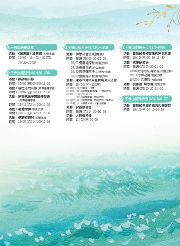 %u5343%u4f5b%u5c71%u672c%u9858%u5bfa(07)372-0999%u6d3b%u52d5%uff1a%u85e5%u5e2b%u7d93%u66a8%u79ae%u656c%u8af8%u4f5b%u6d2a%u540d%u5171%u4fee%u6642%u9593%uff1a10/12(%u65e5)09:30~11:30%u6d3b%u52d5%uff1a%u4f5b%u5b78%u7814%u7fd2%u73ed%u6642%u9593%uff1a%u6bcf%u9031(%u516d)09:30~11:00%u3000%u300010/04%u5927%u60b2%u5fc3%u9640%u7f85%u5c3c%u7d93(%u77e5%u89ba%u6cd5%u5e2b)%u3000%u300010/11%u884c%u4f5b%u4e4b%u9470(%u82e5%u5958%u6cd5%u5e2b)%u3000%u300010/25%u751f%u6d3b%u6f2b%u8ac7(%u82e5%u745c%u6cd5%u5e2b)%u6d3b%u52d5%uff1a%u8b80%u66f8%u6703-%u89e3%u60d1%u7bc7(%u77e5%u89ba%u6cd5%u5e2b)%u6642%u9593%uff1a%u6bcf%u9031(%u56db)09:30~11:00%u5343%u4f5b%u5c71%u798f%u6167%u5bfa(07)681-2764%u6d3b%u52d5%uff1a%u85e5%u5e2b%u7d93%u5171%u4fee%u6642%u9593%uff1a10/05(%u65e5)09:00~11:30%u6d3b%u52d5%uff1a%u6de8%u571f%u6cd5%u9580%u5171%u4fee(%u5c4f%u6771%u83e9%u85a9%u5b78%u8655)%u6642%u9593%uff1a10/09(%u56db)14:30~16:30%u6d3b%u52d5%uff1a%u5c4f%u6771%u4f5b%u5f1f%u5b50%u95b1%u8b80%u5ea7%u8ac7%u6703(%u5c4f%u6771%u83e9%u85a9%u5b78%u8655)%u6642%u9593%uff1a10/11(%u516d)14:30~16:30%u6d3b%u52d5%uff1a%u8001%u50e7%u5e38%u8b5a %u82e5%u5958%u6cd5%u5e2b%u6642%u9593%uff1a10/19(%u65e5)14:30~16:30%u6d3b%u52d5%uff1a%u695e%u56b4%u7d93%u63a2%u8a0e %u77e5%u89ba%u6cd5%u5e2b%u6642%u9593%uff1a10/25(%u516d)14:30~16:30%u5343%u4f5b%u5c71%u66fc%u6b8a%u4f5b%u5bfa(089)348-020%u6d3b%u52d5%uff1a%u85e5%u5e2b%u7d93%u5171%u4fee%u7948%u798f%u6d88%u707d%u958b%u667a%u6167%u6642%u9593%uff1a10/19(%u65e5)09:10~10:30%u5343%u4f5b%u5c71%u822c%u82e5%u5bfa(07)346-1908%u6d3b%u52d5%uff1a%u4f5b%u5b78%u7814%u7fd2%u73ed(%u65e5%u9593%u73ed)%u6642%u9593%uff1a%u6bcf%u9031(%u4e09)09:30~11:00 10/01%u695e%u56b4%u7d93%u63a2%u8a0e(%u77e5%u89ba%u6cd5%u5e2b)%u3000 10/15%u4f5b%u50cf%u4ecb%u7d39(%u82e5%u7384%u6cd5%u5e2b) 10/22%u6089%u63a2%u5f4c%u9640%u6de8%u571f(%u82e5%u5958%u6cd5%u5e2b) 10/29%u91d1%u525b%u7d93%u7814%u8a0e(%u667a%u7fd4%u6cd5%u5e2b)%u6d3b%u52d5%uff1a%u5efa%u5bfa21%u9031%u5e74%u6881%u7687%u7948%u798f%u6d88%u707d%u6cd5%u6703%u6642%u9593%uff1a10/04(%u516d)~12(%u65e5)10/04(%u516d)15:00%u7051%u6de8%u3001%u53ec%u8acb10/05(%u65e5)08:30%u6881%u7687%u5bf6%u61fa(%u958b%u61fa)%u3001%u4f5b%u524d%u5927%u4f9b10/06(%u4e00)~09(%u56db)%u300111(%u516d)%u3000%u3000%u3000%u3000 08:30%u6881%u7687%u5bf6%u61fa%u3001%u4f5b%u524d%u5927%u4f9b10/10(%u4e94)08:30%u6881%u7687%u5bf6%u61fa%u3001%u4f5b%u524d%u5927%u4f9b%u3001%u6388%u7688%u4f9d10/12(%u65e5)10:30%u4f5b%u524d%u5927%u4f9b%u3001%u5927%u8499%u5c71%u65bd%u98df%u6d3b%u52d5%uff1a%u822c%u82e5%u8b80%u66f8%u6703%u6642%u9593%uff1a%u6bcf%u9031(%u516d)14:30~16:30%u6d3b%u52d5%uff1a%u5927%u60b2%u61fa%u5171%u4fee%u6642%u9593%uff1a11/02(%u65e5)09:00%u5343%u4f5b%u5c71%u83e9%u63d0%u8b1b%u5802%u6d3b%u52d5%uff1a%u300a%u89e3%u60d1%u7bc7%u300b%u8b80%u66f8%u6703(%u77e5%u89ba%u6cd5%u5e2b)%u6642%u9593%uff1a10/02%u300116%u300123%u300130(%u56db)%u3000%u3000%u300019:30~21:00