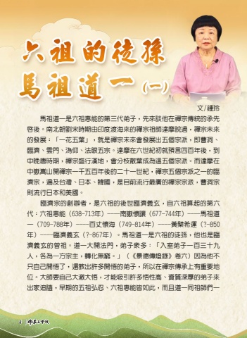 %u6587/%u937e%u73b2%u3000%u3000%u99ac%u7956%u9053%u4e00%u662f%u516d%u7956%u60e0%u80fd%u7684%u7b2c%u4e09%u4ee3%u5f1f%u5b50%uff0c%u5148%u4f86%u8ac7%u4ed6%u5728%u79aa%u5b97%u50b3%u7d71%u7684%u627f%u5148%u555f%u5f8c%u3002%u5357%u5317%u671d%u5289%u5b8b%u6642%u671f%u7531%u5370%u5ea6%u6e21%u6d77%u4f86%u7684%u79aa%u5b97%u7956%u5e2b%u9054%u6469%u8aaa%u904e%uff0c%u79aa%u5b97%u672a%u4f86%u7684%u767c%u5c55%uff1a%u300c%u4e00%u82b1%u4e94%u8449%u300d%uff0c%u5c31%u662f%u79aa%u5b97%u672a%u4f86%u6703%u767c%u5c55%u51fa%u4e94%u500b%u5b97%u6d3e%uff0c%u5373%u66f9%u6d1e%u3001%u81e8%u6fdf%u3001%u96f2%u9580%u3001%u6e88%u4ef0%u3001%u6cd5%u773c%u4e94%u5b97%u3002%u9054%u6469%u5728%u516d%u4e16%u7d00%u521d%u5c31%u9810%u8a00%u56db%u767e%u5e74%u5f8c%uff0c%u5230%u4e2d%u665a%u5510%u6642%u671f%uff0c%u79aa%u5b97%u76db%u884c%u6f22%u5730%uff0c%u6703%u5206%u679d%u6563%u8449%u6210%u70ba%u9019%u4e94%u500b%u5b97%u6d3e%u3002%u800c%u9054%u6469%u5728%u4e2d%u5dbd%u5d69%u5c71%u958b%u79aa%u5b97%u4e00%u5343%u4e94%u767e%u5e74%u5f8c%u7684%u4e8c%u5341%u4e00%u4e16%u7d00%uff0c%u79aa%u5b97%u4e94%u500b%u5b97%u6d3e%u4e4b%u4e00%u7684%u81e8%u6fdf%u5b97%uff0c%u904d%u53ca%u53f0%u7063%u3001%u65e5%u672c%u3001%u97d3%u570b%uff0c%u662f%u76ee%u524d%u6d41%u884c%u6700%u5ee3%u7684%u79aa%u5b97%u5b97%u6d3e%uff0c%u66f9%u6d1e%u5b97%u5247%u6d41%u884c%u65e5%u672c%u548c%u7f8e%u570b%u3002%u3000%u3000%u81e8%u6fdf%u5b97%u7684%u5275%u8fa6%u8005%uff0c%u662f%u516d%u7956%u7684%u5f8c%u4e16%u81e8%u6fdf%u7fa9%u7384%uff0c%u81ea%u516d%u7956%u7b97%u8d77%u7684%u7b2c%u516d%u4ee3%uff1a%u516d%u7956%u60e0%u80fd%uff08638-713%u5e74%uff09----%u5357%u5dbd%u61f7%u8b93%uff08677-744%u5e74%uff09----%u99ac%u7956%u9053%u4e00%uff08709-788%u5e74%uff09----%u767e%u4e08%u61f7%u6d77%uff08749-814%u5e74%uff09----%u9ec3%u6a97%u5e0c%u904b%uff08?-850%u5e74%uff09----%u81e8%u6fdf%u7fa9%u7384%uff08?-867%u5e74%uff09%u3002%u99ac%u7956%u9053%u4e00%u662f%u516d%u7956%u7684%u5f92%u5b6b%uff0c%u4ed6%u4e5f%u662f%u81e8%u6fdf%u7fa9%u7384%u7684%u66fe%u7956%u3002%u9053%u4e00%u5927%u958b%u6cd5%u9580%uff0c%u5f1f%u5b50%u773e%u591a%uff1a%u300c%u5165%u5ba4%u5f1f%u5b50%u4e00%u767e%u4e09%u5341%u4e5d%u4eba%uff0c%u5404%u70ba%u4e00%u65b9%u5b97%u4e3b%uff0c%u8f49%u5316%u7121%u7aae%u3002%u300d%uff08%u300a%u666f%u5fb7%u50b3%u71c8%u9304%u300b%u5377%u516d%uff09%u56e0%u70ba%u4ed6%u4e0d%u53ea%u81ea%u5df1%u958b%u609f%u4e86%uff0c%u9084%u6559%u51fa%u8a31%u591a%u958b%u609f%u7684%u5f1f%u5b50%uff0c%u6240%u4ee5%u5728%u79aa%u5b97%u50b3%u627f%u4e0a%u6709%u91cd%u8981%u5730%u4f4d%u3002%u5927%u5e2b%u8981%u81ea%u5df1%u5927%u6f88%u5927%u609f%uff0c%u624d%u80fd%u5438%u5f15%u8a31%u591a%u609f%u6027%u9ad8%u3001%u8cc7%u8cea%u6df1%u539a%u7684%u5f1f%u5b50%u4f86%u51fa%u5bb6%u8ffd%u96a8%uff0c%u65e9%u671f%u7684%u4e94%u7956%u5f18%u5fcd%u3001%u516d%u7956%u60e0%u80fd%u7686%u5982%u6b64%uff0c%u800c%u4e14%u9053%u4e00%u540c%u7956%u5e2b%u5011%u4e004|